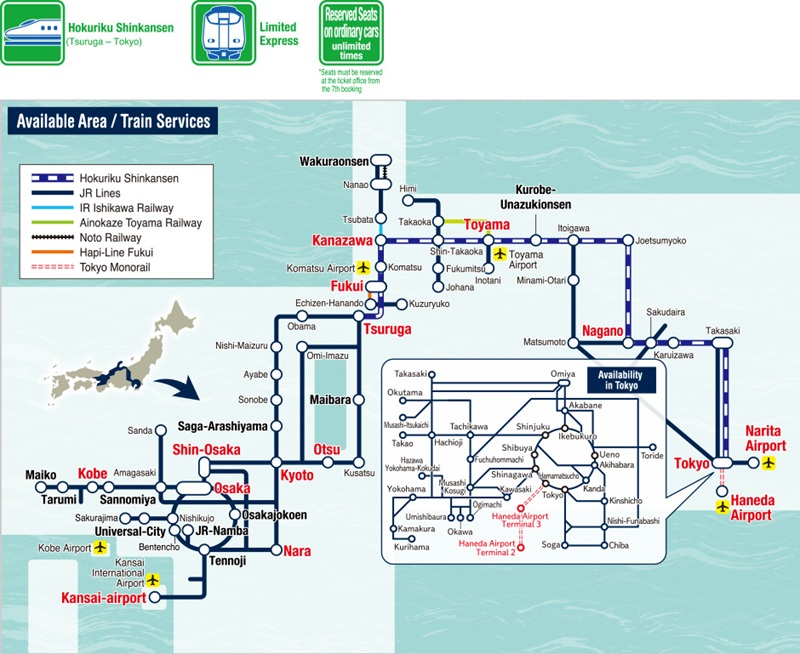 Este pase te permite utilizar todos los trenes JR entre Tokio y Osaka en la ruta Tokio, Nagano, Toyama, Kanazawa, Kioto, Osaka. Se incluye el Hokuriku Shinkansen a Tsuruga.